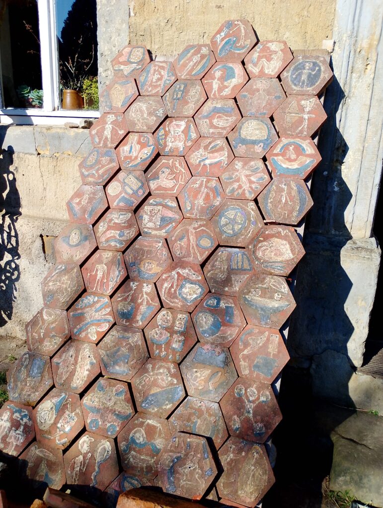 Handeinsgeformte und bemalte Fußbodenkacheln von der Ziegelei Huber in Graupzig